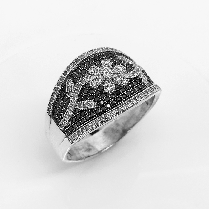 טבעת כסף מצופה רודיום לבן שיבוץ זירקונים לבנים ושחורים פרחים מיקרו פווה