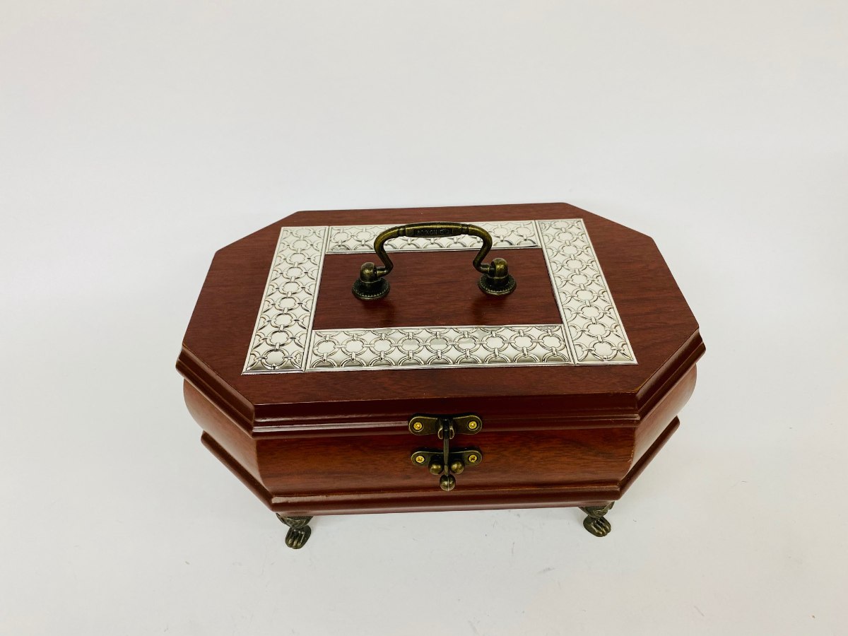 קופסת תכשיטים מהודרת עץ מהגוני מעוטרת בפסי כסף